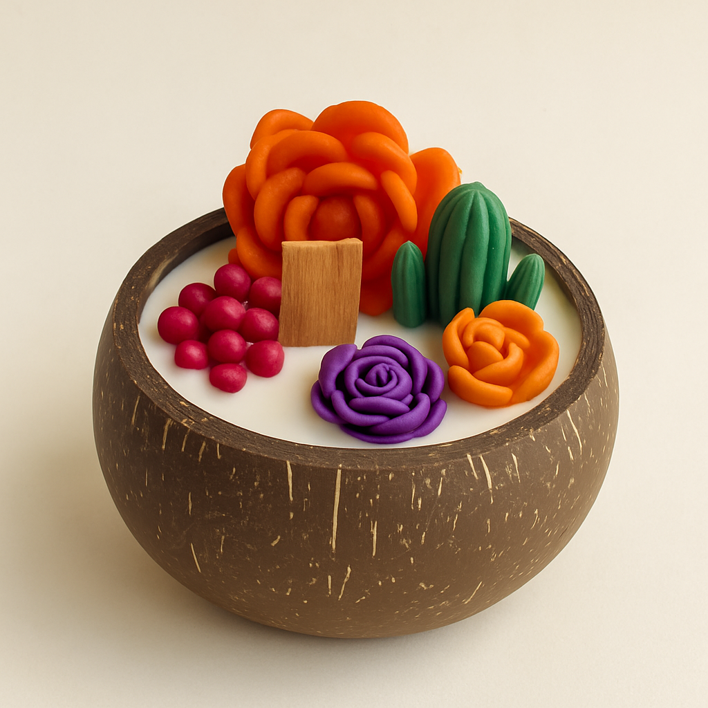 Una vela de coco y madera con detalles de suculentas artesanales que aportan un toque orgánico y delicado. Un diseño simple , natural y sereno que ilumina el espacio con un aroma suave y una estética armoniosa.